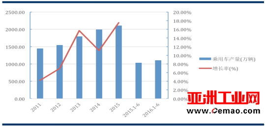 2015 年,全國汽車產(chǎn)銷量分別為 2,450 萬輛和 2,460 萬輛, 同比增長 3.29%和 4.68%。其中,乘用車產(chǎn)銷量分別為 2,108 萬輛和 2,114 萬輛,同比增長 5.82%和 7.30%;商用車產(chǎn)銷量分別為 342 萬輛和 345 萬輛,同比下降分別為 9.97%和 8.97%。 2016 年上半年,全國汽車產(chǎn)銷量分別為 1,287 萬輛和 1,279 萬輛,同比增長 6.41%和 8.10%。其中,乘用車產(chǎn)銷量分別為 1,108 萬輛和 1,101 萬輛,同比增長 7.25%和 9.23%;商用車產(chǎn)銷量分別為 179 萬輛和 179 萬輛,同比下降分別為 1.53%和 1.62%。2011 年至 2016 年 1-6 月乘用車產(chǎn)量及增長率情況如下: